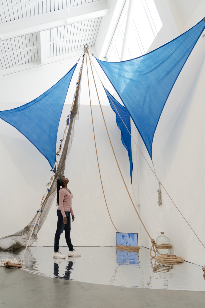 The two-year research project culminated in a 15-foot mixed-media installation titled Ceremonial. Using found objects, rope, fabric, reflective surfaces, and video, she explored “the legacy of care and resilience of the Black working class in Barbados and beyond.” The work, she explained, reflected how ancestral memory and tradition move through the body, how dance, history, and identity intertwine.